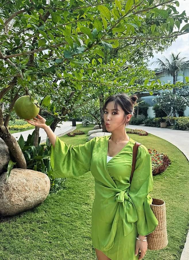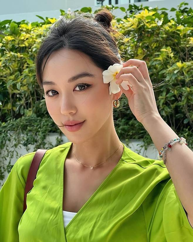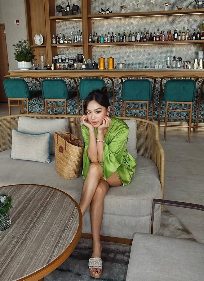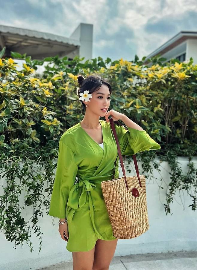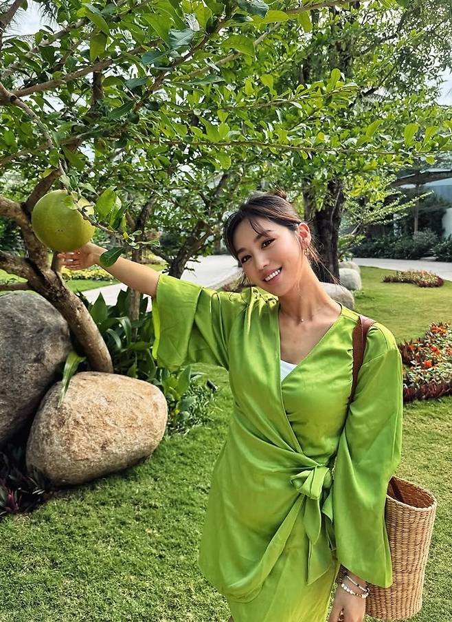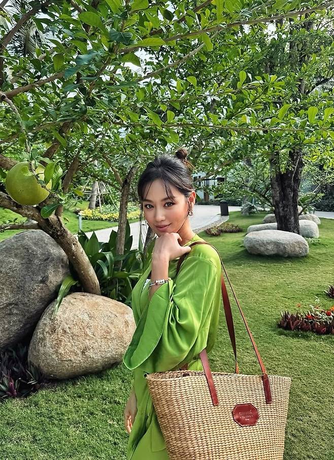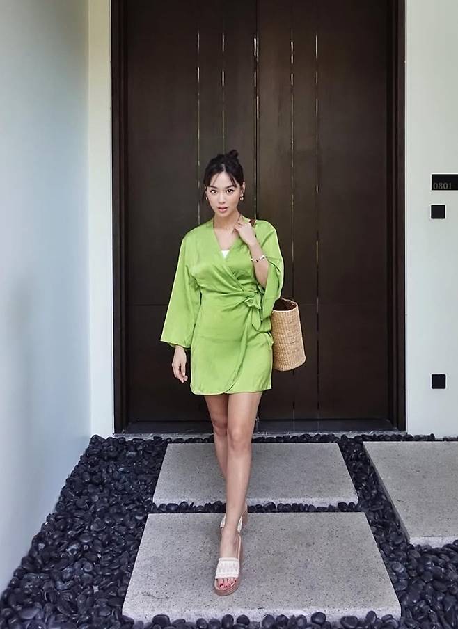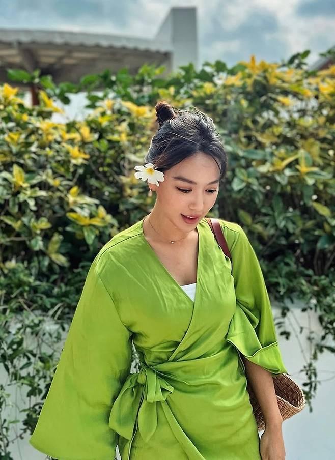 배우 김희정이 베트남 나트랑에서 하의실종 벨티드 랩 가운 리조트룩으로 딴 비율을 뽐냈다.