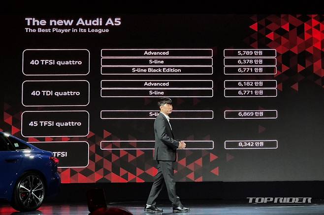 더 뉴 아우디 A5의 가격은 A5 40 TFSI 콰트로 5789만원, A5 45 TFSI 콰트로 6869만원, A5 40 TDI 콰트로 6182만원, S5 TFSI 8342만원부터다. 총 7가지 트림으로 구성되며, 3가지 옵션 패키지가 제공된다. S-라인에는 HUD, B&O 3D 사운드가 기본이며, 헤드레스트 스피커 패키지가 제공된다.