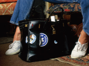 제인 버킨은 이 가방을 9년 동안 달고 살았습니다. 찢어지면 스티커 붙이고, 키링 달고, 안에는 네일클리퍼까지.