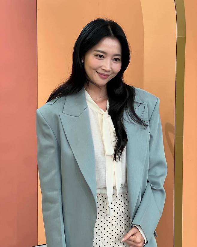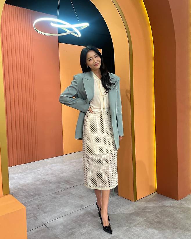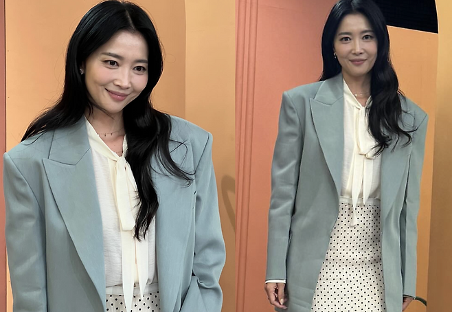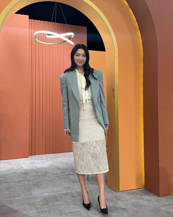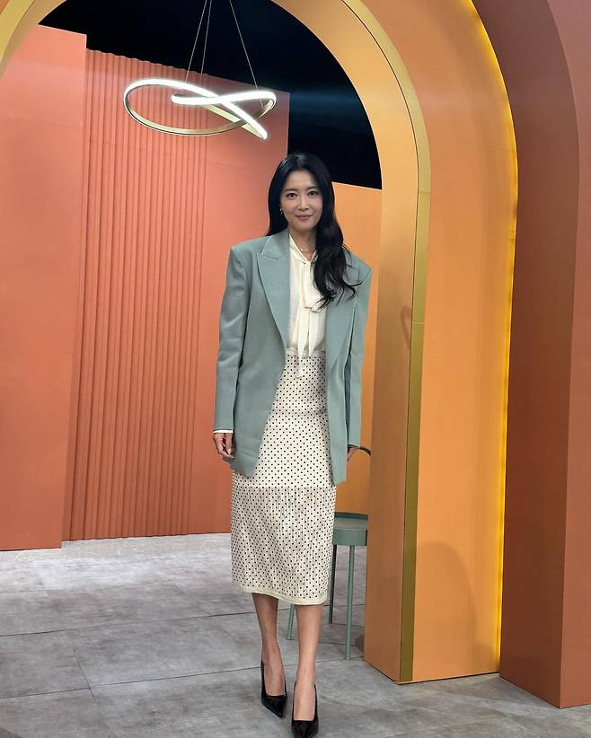 사진 속 오윤아는 화이트 셔츠에 도트무늬 스커트와 하늘색 자켓을 매치해 세련된 스타일을 선보였습니다.