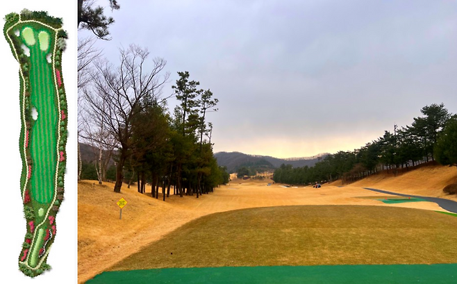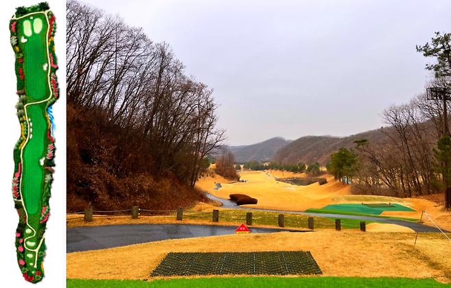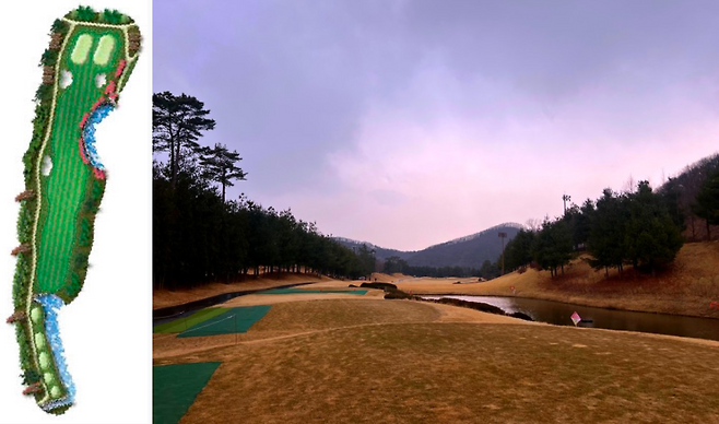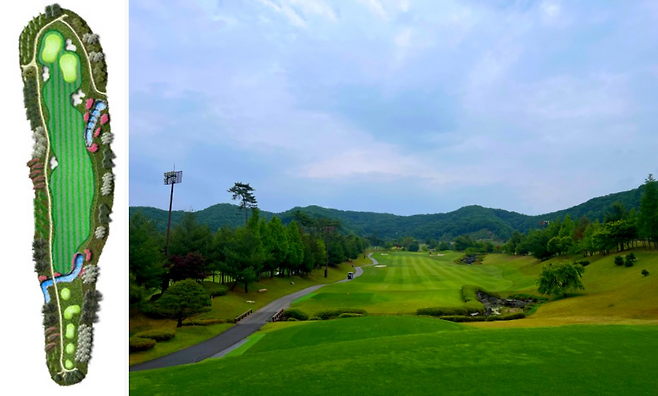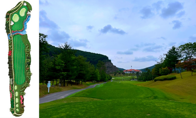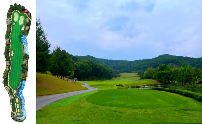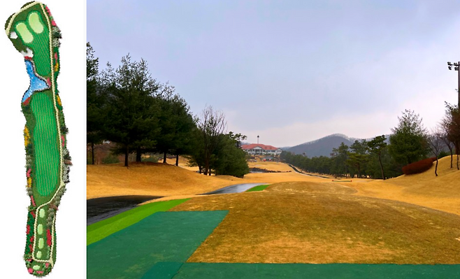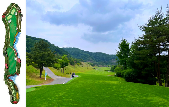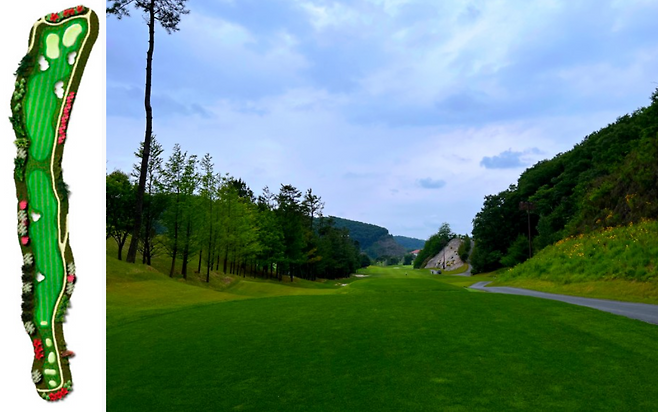 480m 전장의 롱홀입니다. 좌측에 OB가 자리 잡고 있고 우측은 커다란 해저드가 자리 잡고 있어 랜딩 존을 잘 고려하셔야 하는 홀입니다. 완만한 내리막 형태의 홀이라 장타자라면 투온 시도가 가능한 홀입니다.