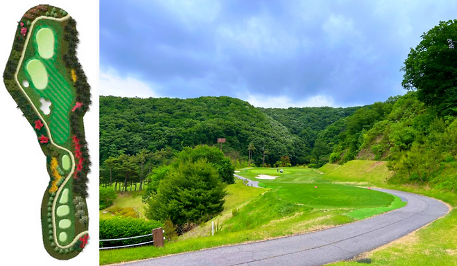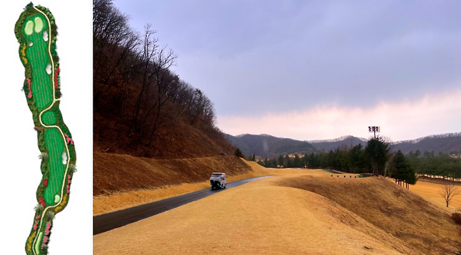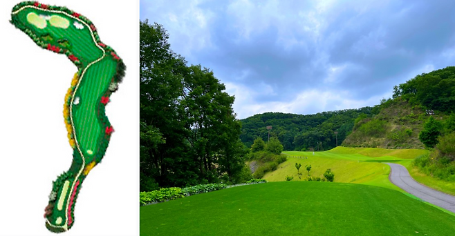 310m 전장의 짧은 미들홀이지만 급격한 오르막으로 보이는 거리보다 긴 홀입니다. 좌측은 OB 구역이고 페어웨이 중앙이나 좌측으로 에이밍하는 것이 좋습니다.