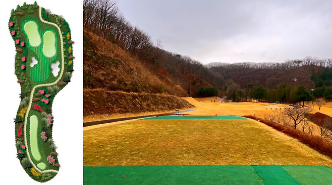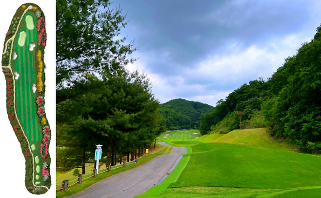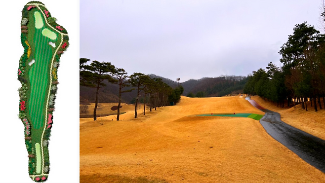 350m 전장의 미들 홀로 좌측은 OB 구역입니다. 코스 중간에 커다란 해저드가 자리 잡고 있어 장타자라면 230m까지 끊어서 플레이하셔야 하는 홀입니다.