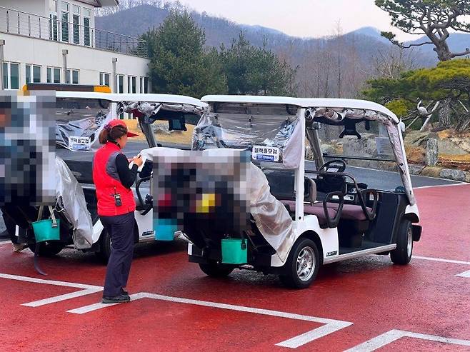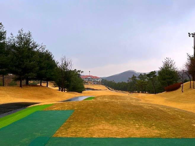 스타트 지점 전경입니다. 내부가 차분하고 정갈한 고급 진 느낌에 비해 외부는 조금 오래돼 보이기도 합니다. 18홀 골프장이다 보니 카트 대기 장소가 붐비거나 하진 않았습니다.
