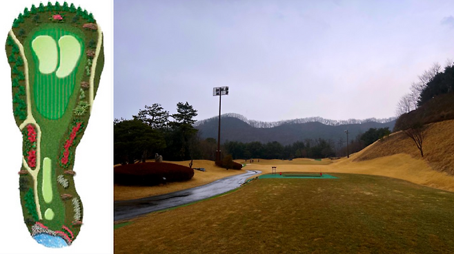 이 홀은 티샷보다 세컨드 샷을 신경 쓰셔야 하는 홀인데, 좌 그린을 사용할 경우 그린이 좌우폭이 좁고 위아래로 긴 형태이고 그린 좌측으로는 여유가 없어 정확한 샷을 요구하는 홀입니다.