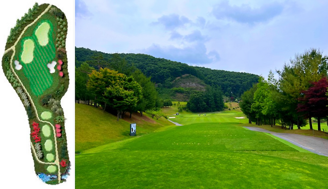 295m 전장의 짧은 내리막 미들홀이지만, 로컬룰로 드라이버 티샷은 안되는 홀입니다. 페어웨이 중간에 커다란 벙커가 자리 잡고 있어 벙커전까지 180m 이내로 티샷을 하셔야 하는 홀이기도 합니다.