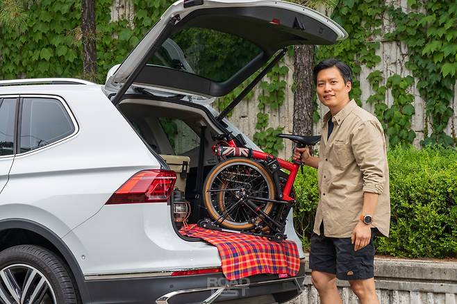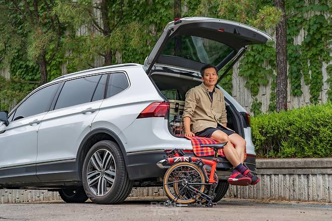 트렁크를 열자, 그가 평소 쓰는 캠핑용품이 한가득 들어있었다. 티구안 올스페이스의 기본 트렁크 용량은 230L. 3열 및 2열 시트를 접었을 때 용량은 각각 700, 1,775L다. 기본형 티구안(기본 615L, 2열 폴딩 시 1,655L)보다 휠베이스를 110㎜ 늘이면서 적재 공간도 더 확보했다. 덕분에 캠핑용 테이블과 아이스박스, 워터저그까지 여유롭게 실어 왔다. 2년 전부터 푹 빠져있는 브롬튼(BROMPTON) 접이식 자전거도 가뿐하게 담았다.
