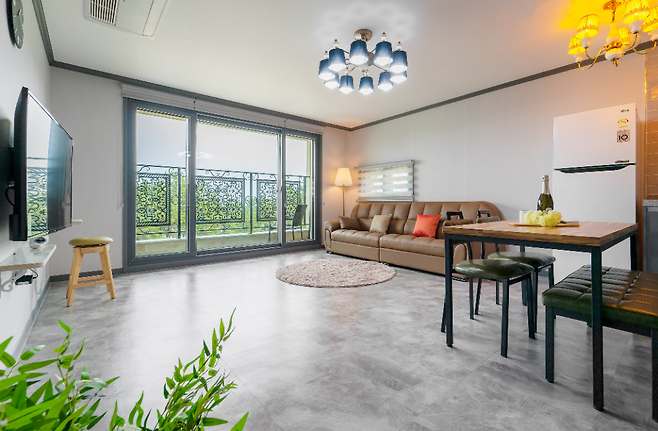 원룸형 펜션과 독채펜션이 준비되어 있어, 여행 스타일에 따라 선택할 수 있답니다. 원룸형 펜션은 깔끔하게 정돈된 인테리어와 고급스러운 타일 바닥이 인상적이에요. 독채펜션은 동남아 휴양지에 온 듯한 느낌을 주는 외관과 함께, 내부에는 주방과 식탁이 갖추어져 있어 가족 단위 여행객에게 인기가 많아요.