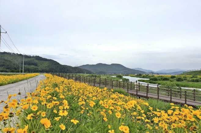 길 양쪽에 핀 아름다운 금계국 속으로 걸어가면 근처에서 탐진강 생태습지원도 만나볼 수 있다.