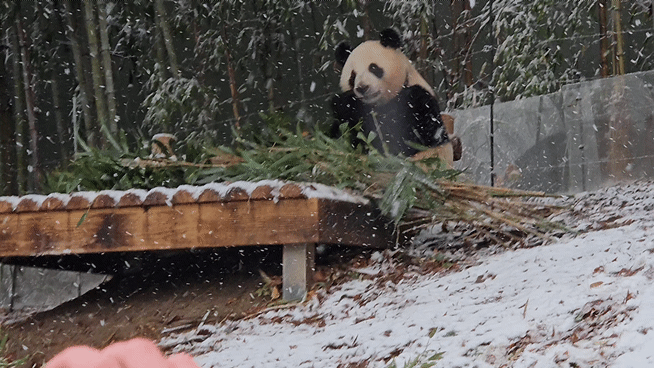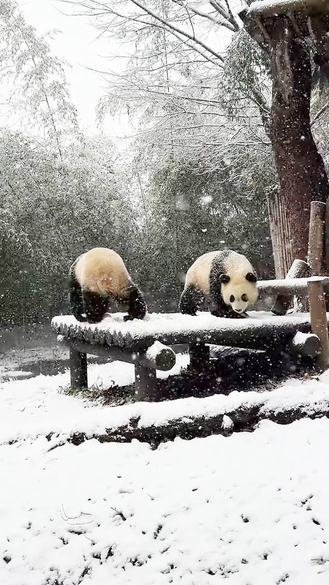 언제나 낭만 판다인 러바오는 물론이고, 처음으로 밖에서 겨울을 맞는 루이후이, 그리고 작년에 내실에서 아이들을 돌보느라 밖에 나가지 못한 아이바오를 환영하듯 눈은 펑펑 예쁘게도 내렸는데요.