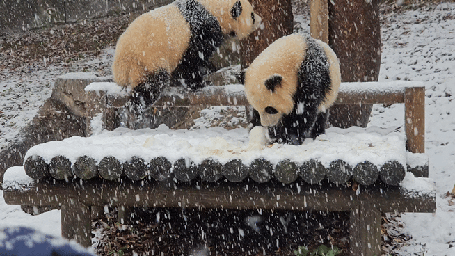 두 아기 판다는 의자 등받이 위를 걸어보기도 하고, 눈의 냄새를 맡아보며 처음 느껴보는 '하얀 세상'을 조금씩 탐구해갔습니다.
