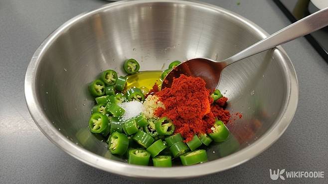 이 레시피의 핵심은 '고추기름 완성도'다. 먼저 청양고추 5개를 얇게 썰고, 올리브유 1큰술과 소금 2꼬집, 고춧가루 4큰술을 섞는다. 여기에 뜨겁게 끓인 올리브유 6큰술을 붓는다.