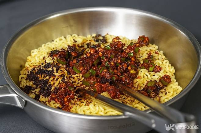 이렇게 조리한 짜파게티는 보통의 짜장라면 대비 붉은빛이 돌며, 매운맛이 강하게 느껴진다.
