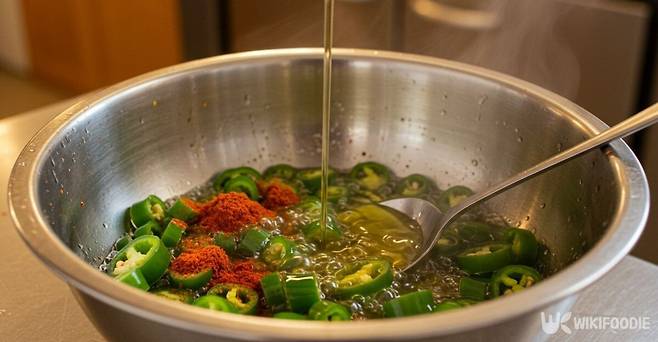 기름 온도에 따라 고추기름의 향과 맛이 결정되기 때문에 기름은 충분히 끓여야 한다. 이후 후레이크 스프와 함께 섞으면 매콤한 고추기름 양념이 완성된다.