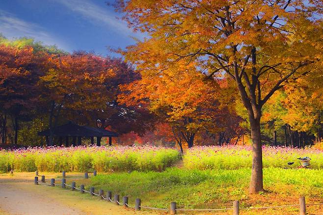 알록달록 아름다운 단풍과 수줍은 코스모스가 만개하여 산책하기 좋은 곳입니다.