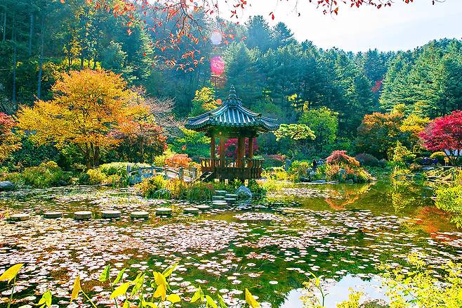아침고요수목원 서화연은 가장 한국적인 전통미를 갖춘 테마공원으로 수려한 연못과 화려한 단풍, 전통적인 정자가 한데 어우러진 가을 명소입니다.