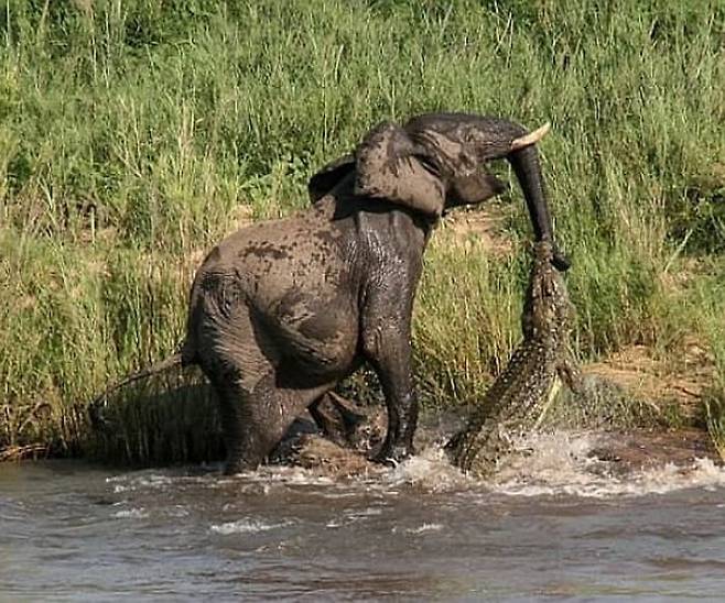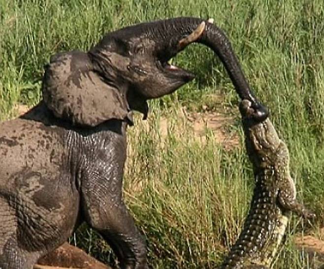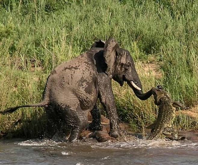 단단히 빡친 코끼리는 악어가 문 코를 번쩍 들어 올리더니 장난감 휘두르듯 악어를 위아래로 흔들어서 땅바닥에 패대기치는 것이었습니다.