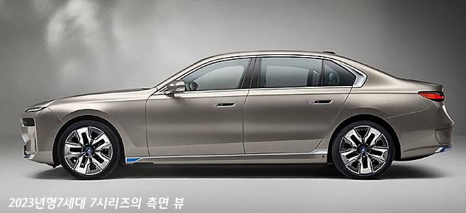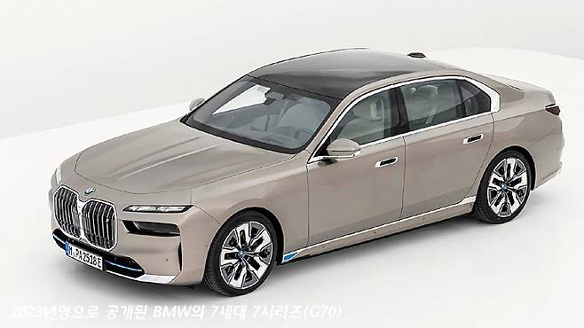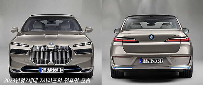 새로이 공개된 2023년형 7세대 7시리즈 모델은 사실상 모든 것을 갈아 엎는 변화를 보여준다. 특히 전면의 라디에이터 그릴의 디자인과 상하로 분리된 헤드 램프와 주간주행등의 전면을 보면 차량의 존재감은 정말로 확실하다.