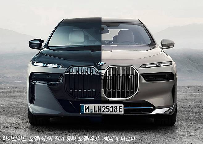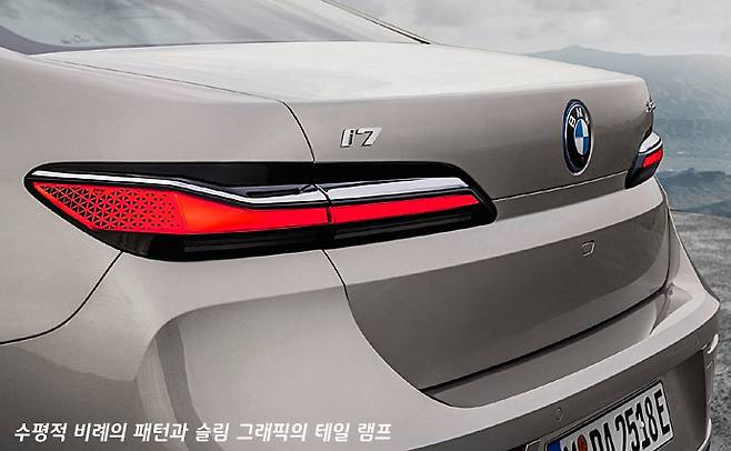 그런데 앞 범퍼의 디테일이 전기 동력 모델 i7과 엔진을 탑재한 7시리즈에서 약간의 차이를 보이고 있다. 전기 동력 모델은 주로 수평 기조의 조형이 강조돼서 어딘가 전자제품 같은 인상이 들기도 한다. 물론 어떤 부분 때문에 그렇다고 잘라 말하기는 어렵지만, 전반적인 앞 모습의 인상이 그런 느낌이다.