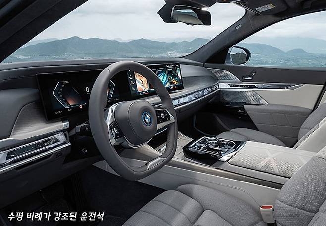 변화된 감각은 실내에서도 눈에 들어온다. 전기 동력 SUV모델 iX와 거의 비슷한 감각의 완전한 직사각형 디스플레이 패널이 운전석 클러스터 위치에 자리잡고 있고, 그 아래에는 마치 크리스털 감각으로 입체 형상의 투명 트림이 우드 트림을 대신하고 있고, 조명 효과까지 들어가 있다.