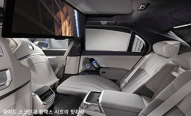 그렇지만 7세대 7시리즈의 실내에서 가장 주목되는 건 뒷좌석 천정에 달린 와이드 스크린일 것이다. 이 스크린 하나로 실내 분위기는 완전히 압도되는 인상이다. 게다가 앞 좌석 시트 등받이는 헤드 레스트 일체형 디자인이다. 대부분의 전통적 세단이 분리형 헤드 레스트를 채택한 것은 뒷좌석 승객의 시야를 위한 것이었지만, 이제 7세대 7 시리즈는 와이드 스크린으로 인해 그 문제로부터 자유로워진 건지도 모른다.