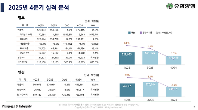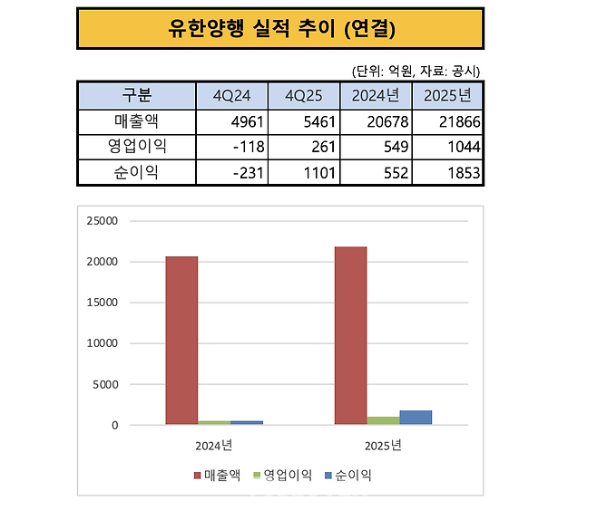 11일 유한양행은 지난해 연결 기준 영업이익이 전년보다 90.2% 증가한 1044억원을 기록했다고 공시했다. 같은 기간 매출은 5.7% 늘어난 2조1866억원, 당기순이익은 235.9% 증가한 1853억원으로 집계됐다. 4분기 기준으로도 매출은 5461억원으로 전년 동기 대비 10.1% 올랐고 영업이익과 순이익은 각각 261억원, 1101억원을 기록하며 모두 흑자로 돌아섰다.