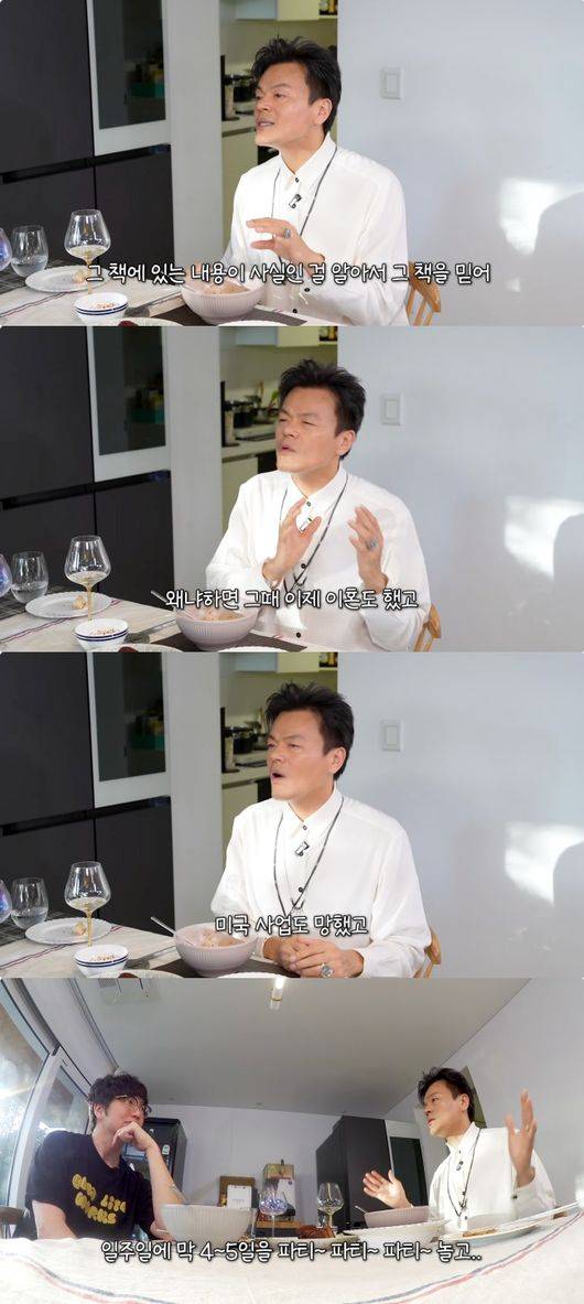 박진영은 "이혼도 했고 미국 사업도 망했고 다시 일어나야 했다. 결혼했을 때 1%가 비어 있다고 생각해 메꾸려고 했었다. 이혼하고 나서 펜트하우스에 살면서 일주일에 4~5일씩 파티를 했다. 2년을 지냈다"라고 털어놨다.