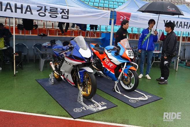 5년 만에 다시 열리는 야마하 패밀리 페스티벌 행사 당일 많은 사람들이 걱정한 것처럼 아쉽게도 비가 왔다. 비가 올 수 있다는 일기예보가 있긴 했지만 오전부터 부슬부슬 내리는 비 덕분에 당일 참석하는 라이더의 수는 적을 수밖에 없었다. 사실 야마하 페밀리 페스티벌은 대대로 날씨가 좋기로 유명해서 단 한 차례도 비가 온 적이 없었다. 하지만 다행히 비는 많이 오지 않고 행사는 취소되지 않고 그대로 진행됐다. 일기예보를 본 사람들은 비옷과 우산 등을 챙겨 미리 준비를 했고 덕분에 모터사이클을 타지 않고 차를 타고 참가한 사람들도 많았다. 행사가 열린 여주종합운동장에는 전국의 야마하 딜러점들이 전날부터 텐트를 치고 준비를 했고 참가업체들 역시 부스를 꾸려 제품 등을 전시했다. 또한 야마하 모터사이클을 기반으로 한 다양한 동호회들 역시 텐트를 치고 공간을 마련했다.