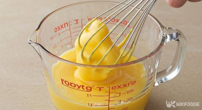 4. 다른 볼에 계란 2개를 넣고 잘 풀어준 뒤, 알룰로스 3스푼, 소금 조금, 바닐라 익스트랙 8방울을 넣어 섞는다.