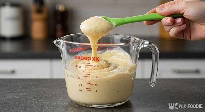6. 반죽은 숟가락으로 떠서 천천히 흐를 정도가 적당하다. 덩어리가 많으면, 믹서기를 사용해 부드럽게 간다.