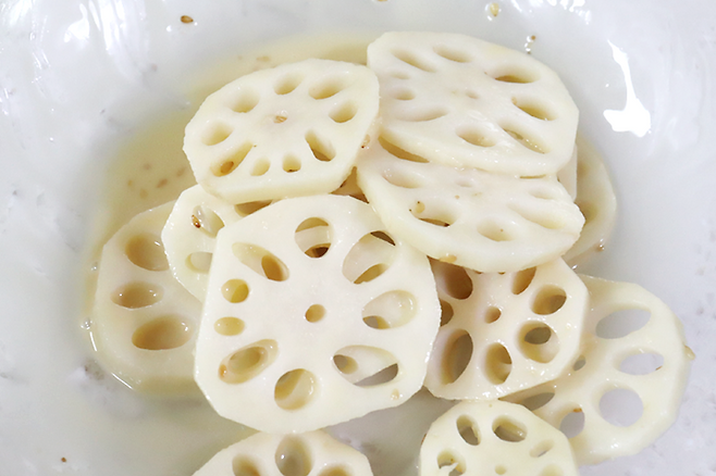 물기를 뺀 연근에 참깨 드레싱을 적당히 뿌려 골고루 버무립니다. 시판용도 좋고, 직접 만들 땐 깨를 갈아 플레인 요거트와 소금 한 꼬집을 섞으면 수제로 만들 수 있어요.
