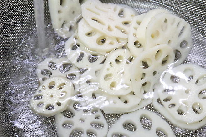 냄비에 물을 끓이고 소금 반 스푼을 넣어요. 끓으면 연근을 넣고 2분간 데친 뒤 찬물에 헹굽니다. 체에 밭쳐 물기를 완전히 빼주세요.