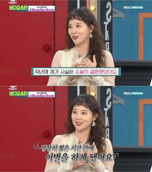 방송된 MBC에브리원 '비디오스타'에 출연해 "작년에 제가 조용히 결혼했다. 굉장히 짧은 시기 안에 이별을 하게 됐다"고 밝히며 화제를 모았습니다.