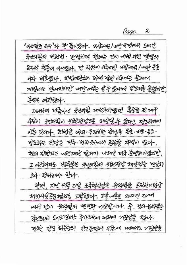 현재 윤석열 대통령의 행태에 대해서도 신랄하게 비판했다. "특검의 소환에 불응하고, 재판에도 불출석한다. 대국민 사과는 하지 않으면서 극우단체 집회에는 메시지를 보내고, 미국에서 온 부정선거 음모론자는 만나려고 한다"며 "폭탄주 실력을 뽐내던 자가 몸이 아파 수사를 받지 못하겠다고 칭얼댄다"고 비꼬았다.