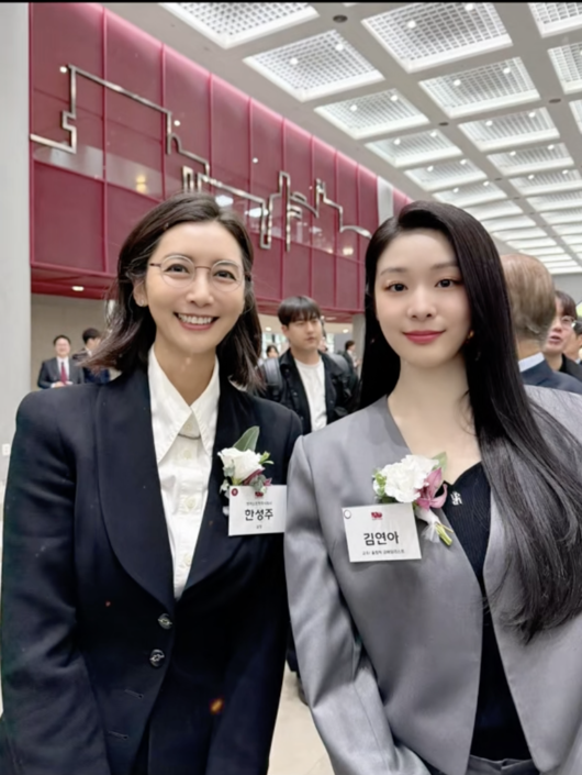 최근 한성주는 자신의 개인 틱톡 계정에 “자랑스러운 김연아 선수, 후배와 함께~~”라는 글과 함께 사진 한 장을 게재했다. 공개된 사진에는 고려대학교 개교 120주년 행사 현장에서 나란히 선 두 사람의 모습이 담겼다. 모던한 블랙 정장을 차려입은 한성주와 김연아는 두 손을 곱게 모은 채 환하게 미소를 지으며 카메라를 응시하고 있었다.