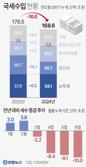 며칠 전 기획재정부가 발표한 2024년 6월 누계기준 국세수입 자료를 보자. 소득세는 전년 동기 대비 유지(+0.2조원)되고, 부가가치세도 소비증가 및 환급 감소로 납부실적 증가추세가 유지(+5.6조원)된 반면, 법인세는 지난해 기업실적 저조로 납부실적이 감소(-16.1조원)하고, 종합부동산세 등도 감소했다. 이로서 2024년 6월 누계 국세수입은 168.6조원으로 전년동기 대비 10.0조원 감소했다고 설명하고 있다.