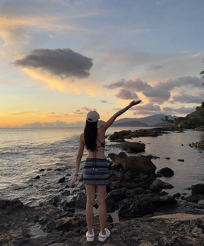소품 선택 역시 돋보인다. 화이트 컬러의 캡 모자는 전체적인 룩에 스포티한 감각을 더하며, 긴 생머리와 자연스럽게 어우러졌다. 발에는 화이트 플랫폼 샌들을 신어 캐주얼한 매력을 놓치지 않았고, 높이가 더해져 각선미를 더욱 길고 매끈하게 보이게 했다. 그가 바닷가 바위 위에 서서 팔을 뻗은 포즈는 자유분방한 분위기와 함께 여행지 특유의 설렘을 담아내 시선을 끌었다.