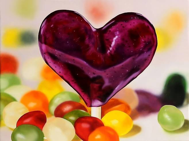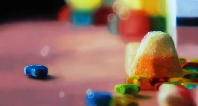 사진 같죠? 정보연 작가님의 유화랍니다! 정보연 작가님은 일상 생활속에서 쉽게 볼 수 있는 캔디를 알록달록한 색상과 극사실주의 기법으로 표현하고 있습니다.