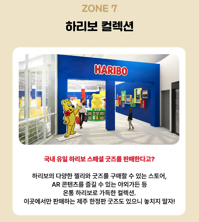 독일에서 온 세계적인 젤리 브랜드 '하리보'가 세계 최초 대규모 체험형 미디어 전시회 <하리보 해피월드 인 제주-젤리섬으로의 초대>를 제주도에서 7월부터 선보입니다. '하리보 해피월드'는 작년 인사동에서도 전시되어 하리보 팬들의 큰 인기를 얻었었는데요, 이번 제주도에서는 서울 전시보다 한층 더 컬러풀하고 풍성하도록 1,200평의 넓은 실내 공간에서 다양한 테마로 꾸몄다고 합니다.