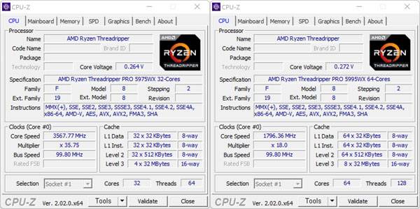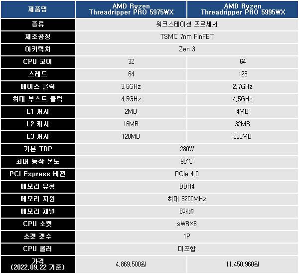 보드나라에서 테스트한 제품 역시 라이젠 스레드리퍼 프로 5000 WX 시리즈의 최상위 모델에 해당하는 64코어 128스레드의 5995WX와 32코어 64스레드를 가진 5975WX다.
