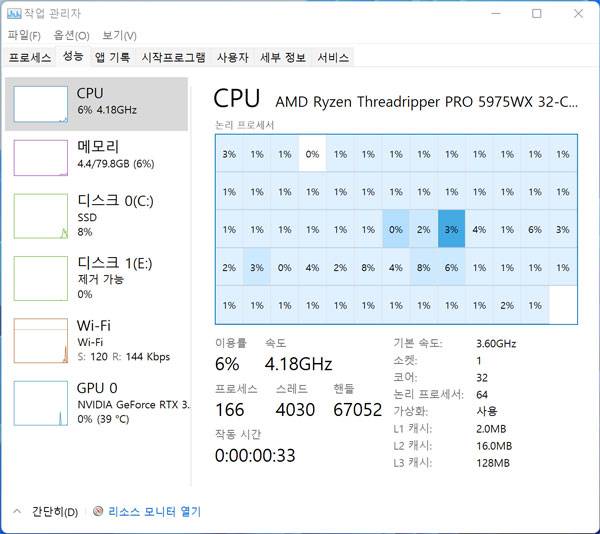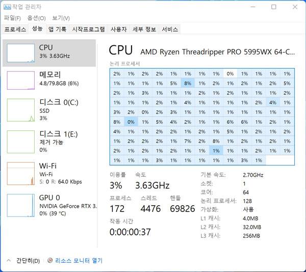 운영체제는 윈도우 11 프로 64비트(Windows 10 Pro 64-bit) 버전을 사용했다. 일반 CPU는 작업 관리자의 논리 프로세서에서 CPU 사용률도 함께 표시되기 마련인데, 32코어 64스레드의 라이젠 스레드리퍼 프로 5975WX와 64코어 128스레드의 5995WX는 스레드 숫자가 너무 많아 숫자로만 간신히 보여준다.