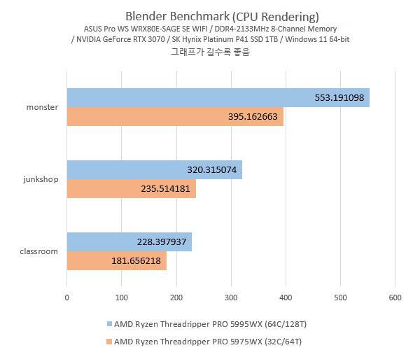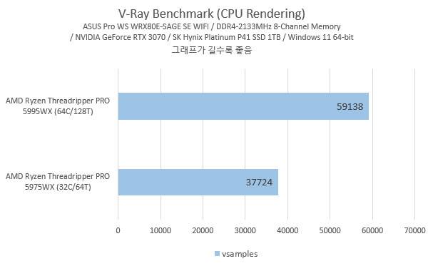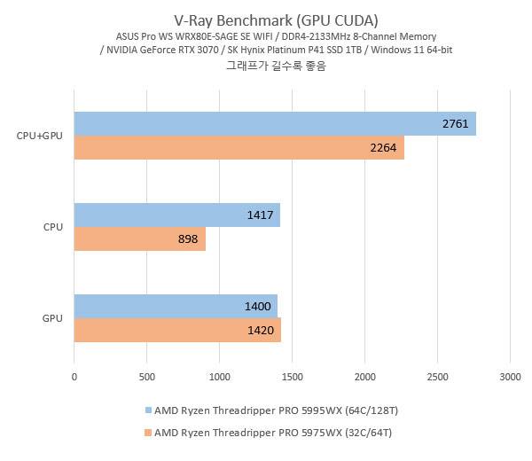 V-Ray 벤치마크를 보면 늘어난 CPU 코어 및 스레드가 단순히 CPU 렌더링 작업 뿐만 아니라 GPU CUDA 작업에도 영향을 준다는 것을 알 수 있다. CPU를 쓰지 않는 지포스 RTX 3070 단독 테스트에서는 두 시스템의 GPU 렌더링 성능에는 차이가 없고 오히려 5975WX쪽 결과가 살짝 높게 나왔는데, CPU 렌더링 및 CPU와 GPU를 동시에 사용하는 작업에서는 더 많은 코어와 스레드를 가진 라이젠 스레드리퍼 프로 5995WX 시스템의 결과가 높게 측정됐다.