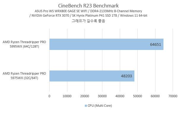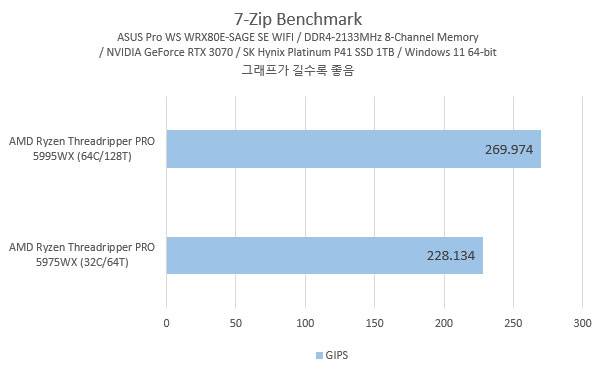 CPU 코어와 스레드가 2배 늘어난 것에 비해 생각했던 만큼 성능 차이가 크진 않았는데, 여기에는 64코어 128스레드의 5995WX의 베이스 클럭이 더 낮다는 것과 WRX80 테스트 시스템이 8채널 메모리지만 메모리 모듈 혼용으로 클럭이 DDR4-2133MHz로 낮게 들어간 점도 작용한듯 싶다.