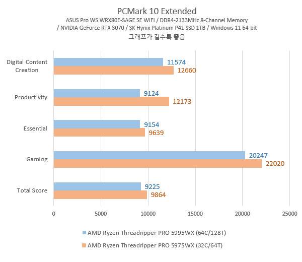 반면 CPU 멀티 코어/스레드 숫자보다 CPU 클럭이 좀더 유리한 작업에서는 두 CPU의 성능 차이가 없거나 오히려 베이스 클럭이 높은 라이젠 스레드리퍼 5975WX의 점수가 높게 나오는 결과도 있었다.