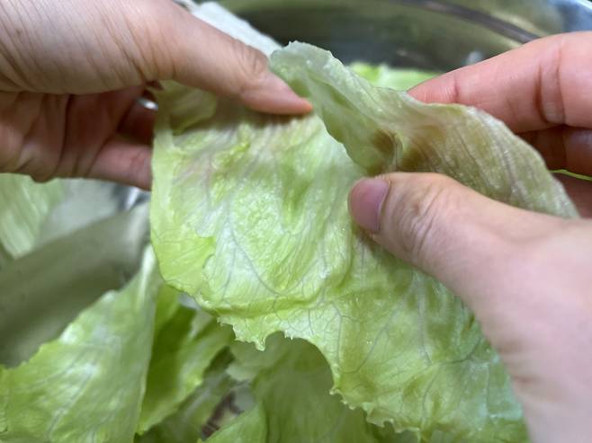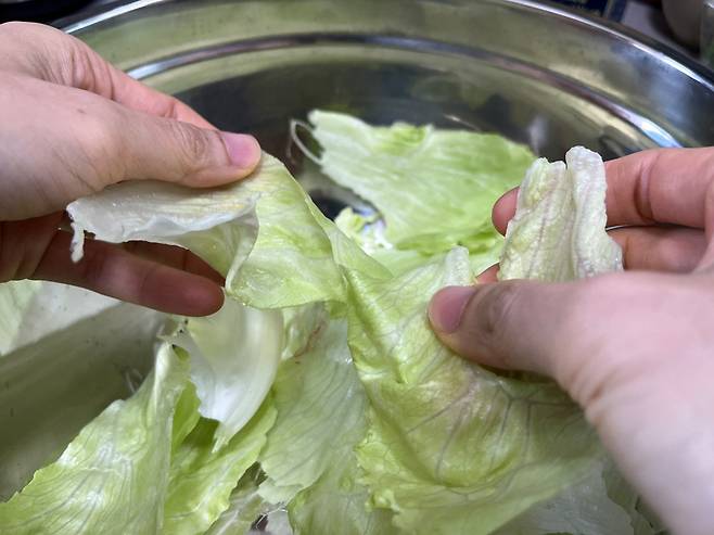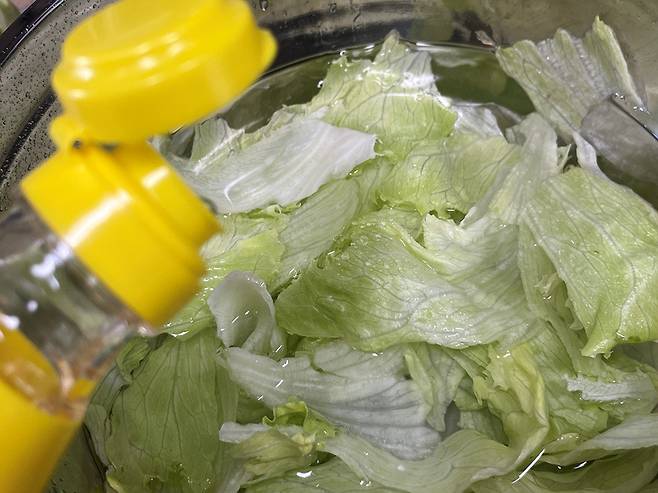 작게 뜯은 양상추 잎은 찬물에 푹 담그고 식초 1~2 방울을 떨어뜨려 3분 정도 둡니다. 양상추에는 간혹 작은 벌레나 미세한 흙먼지 등이 남아있기 때문에 세척이 필수입니다.