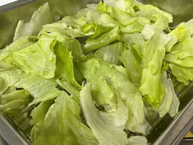 깨끗한 물로 1~2회 헹궈서 건져낸 다음 물기 잘 빠지는 채반 등에 올려 물기를 건조합니다. 양상추에 물기가 있으면 금방 무르고 부패하면서 보관 기간이 짧아집니다.