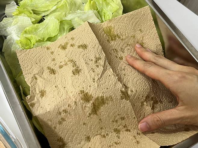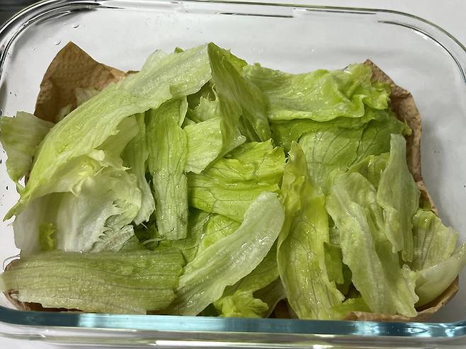 그 위에 세척한 양상추를 넣어 보관하세요. 키친타월은 이틀 정도 지나면 젖어서 축축해지는 경우가 있습니다. 그럴 때는 새것으로 교체해 주세요.