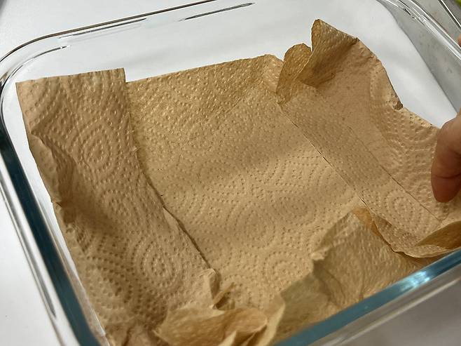 야채를 뚜껑 닫아 보관하면 자연스레 수분이 생기기 때문에 밀폐용기 아래에 키친타월을 깔아줍니다.