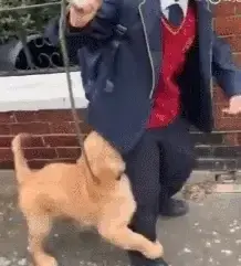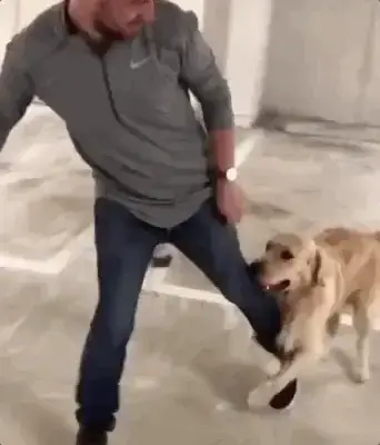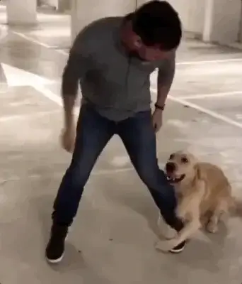 주인은 자세를 바꾸고 골든 리트리버를 멀리 옮기려고 최선을 다해봅니다.