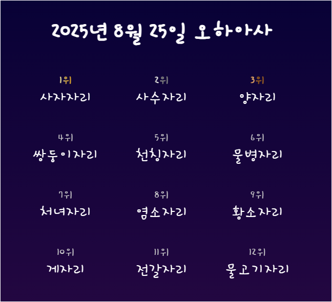 본 글은 2025년 8월 25일 기준 공개된 정보를 정리한 것으로, 오하아사 운세와 별자리 순위는 단순 참고용입니다. 실제 운세 결과는 개인의 생활, 선택, 환경에 따라 달라질 수 있으며, 과학적 근거를 기반으로 하지 않습니다. 따라서 본 내용을 맹신하기보다는 가볍게 참고하시기 바랍니다.